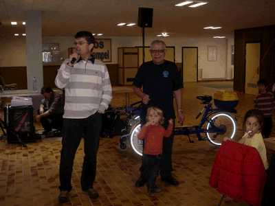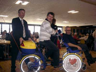 Nach dem Mittagessen in der OS-Aula überreichte der Verein "UBS-Mitarbeiter helfen" Tandem 91 ein neues Spezialvelo im Wert von über 13'000 Franken. Das Rollstuhl-Velo wurde von Fredy Kalbermatter, Geschäftsstellenleiter UBS Steg-Gampel, und René Previdoli, Vorstandsmitglied "UBS-Mitarbeiter helfen"/Leiter Privatkunden UBS Brig, an Tandem 91 übergeben.